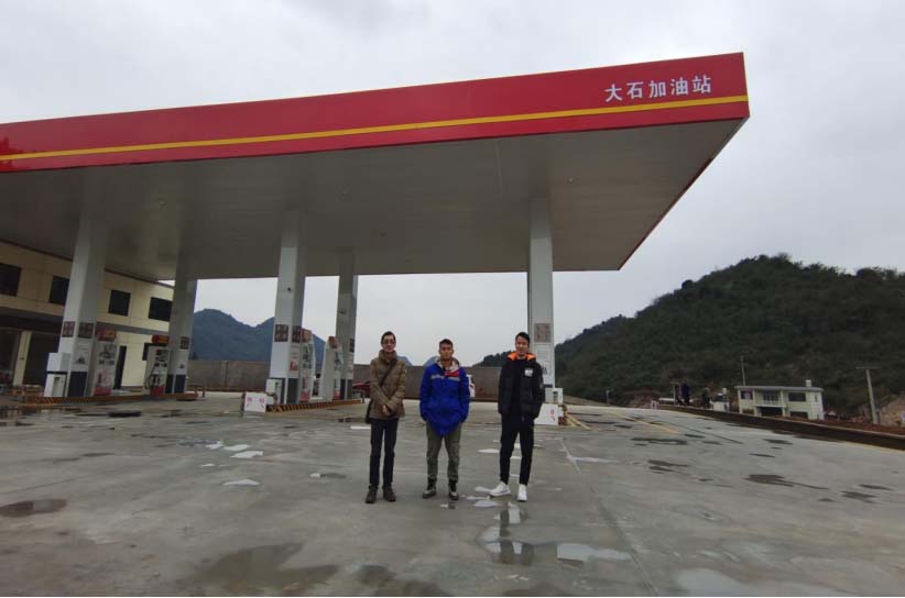 评价师现场照片(从左至右为业主、项目负责人张筑南、加油站员工、评价师蒋仁波)